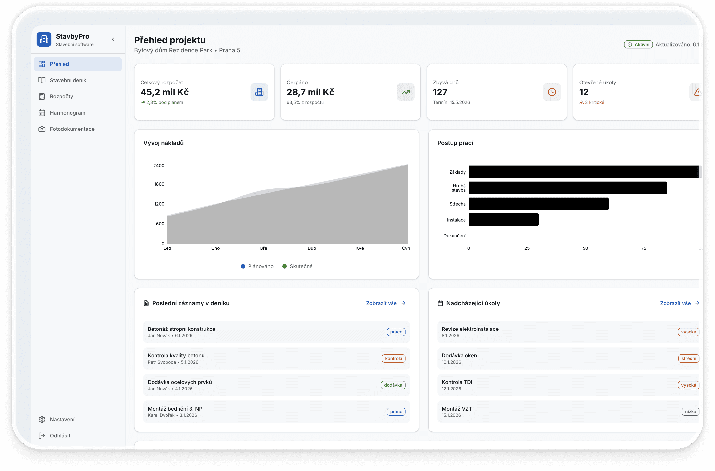 Zbavte se papírování a mějte pod kontrolou každý metr i korunu. Náš software propojuje terén s kanceláří, hlídá termíny v harmonogramu a automatizuje stavební deník, abyste se mohli soustředit na budování, ne na administrativu.